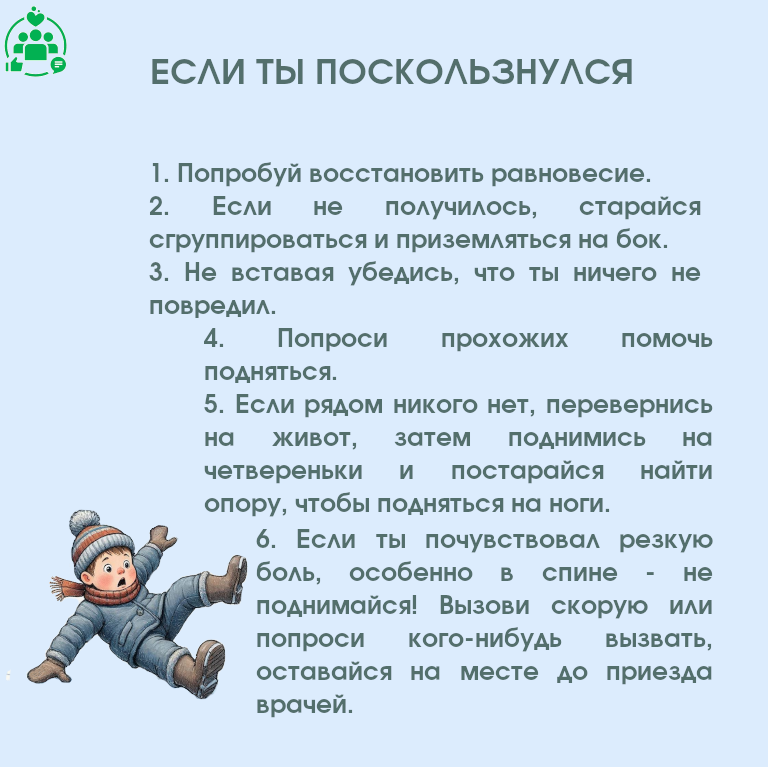 - если ты видишь участок тротуара с гололедом, обойди его. Если это сделать не получается, то шагай по льду медленно, наступая на всю подошву;